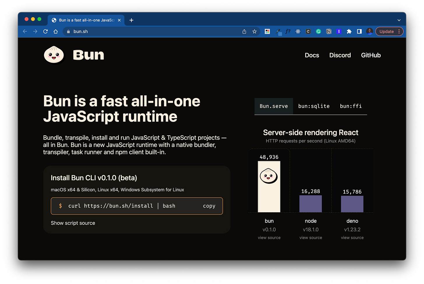 Bun is a new JavaScript runtime with native bundler, transpiler, task runner, and npm client.